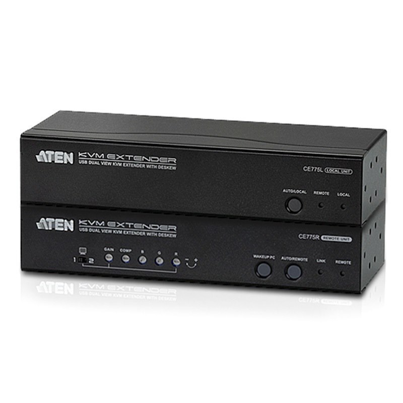 Aten CE-775 - USB Dual View KVM Extender with Deskew ATEN CE775 Dual View KVM Extenders with Deskew function allows access to a computer system from a remote Dual View console up to 300 m away. The dual view function provides support for two displays, allowing the video output to seamlessly display on two monitors. Its advanced PC Wake - Up feature that allows you simply uses a pushbutton from the remote dual view console to wake a PC at the local site via RS-232, no need to go to the local site to wake up the PC. It eliminates the need for traveling back and forth between the local computer and remote console, effi cient and flexible. Use the improved built-in front panel tuners to easily adjust the picture quality. In addition, you can automatically synchronize the time delay of RGB signals in order to compensate for distance, easy and fast than ever.